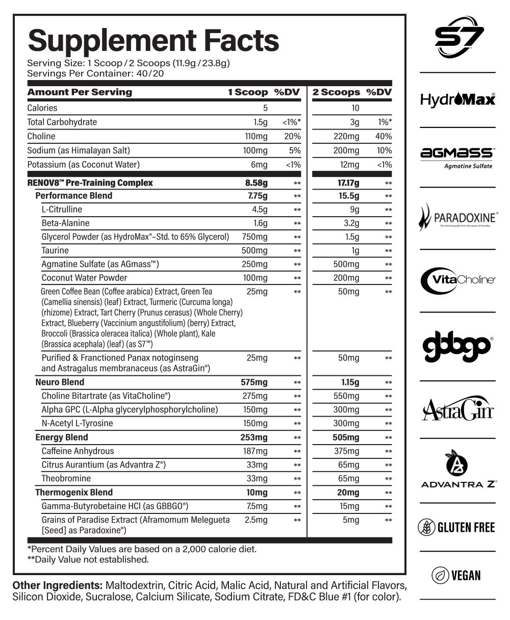 Introducing RENOV8—a fully-loaded, transparent formula that blows the lids off every other pre-workout on the market. Arriving in three variations (high stim, mid stim, and stim free) and two mouth-watering flavors, RENOV8 aims to redefine the pre-workout category as we know it. Its transparent formula boasts a slew of precisely-dosed ingredients that serve as the backbone to its disruptive mission of stripping the industry of mediocrity. Equipped with an array of curated blends designed to maximize pump, focus, energy, and heat, RENOV8 proves itself to be anything but ordinary.